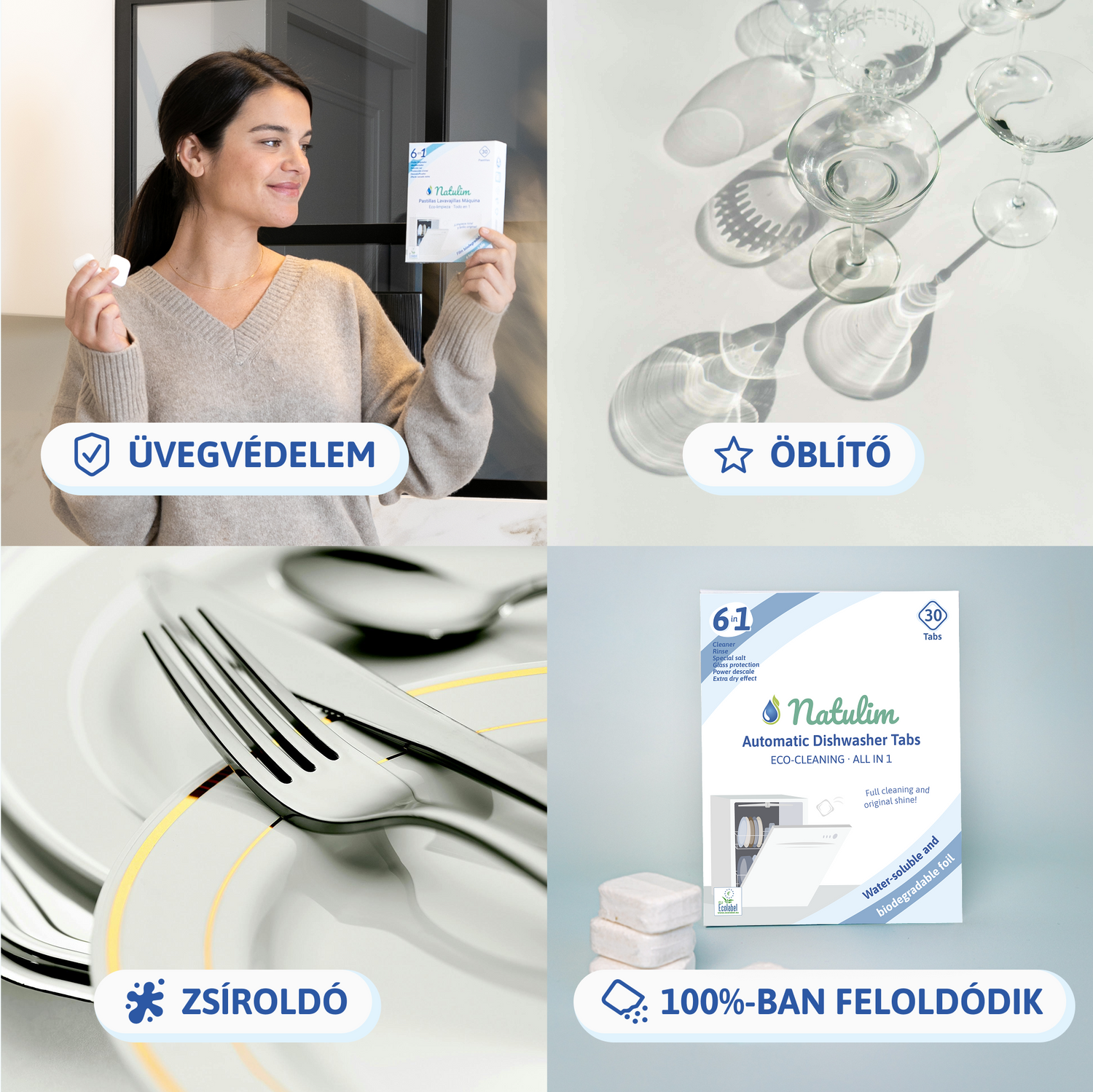 Wir nennen es 6-in-1, weil jede Tablette Folgendes enthält: Fettlöser, Glanzverstärker, Anti-Kalk, Salzfunktion, Glasschutz und extra Trocknungseffekt.